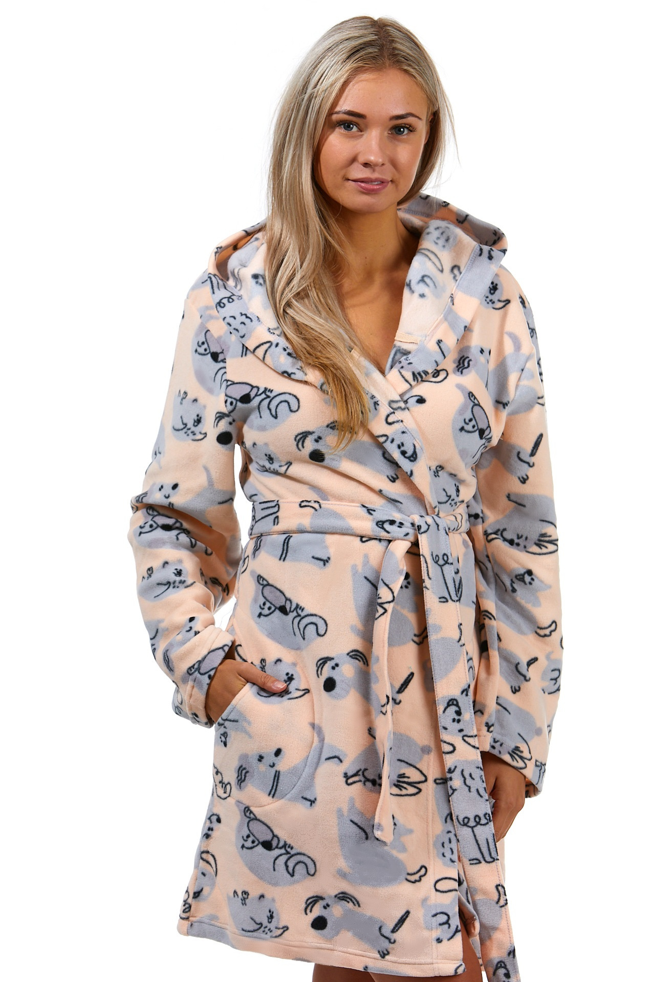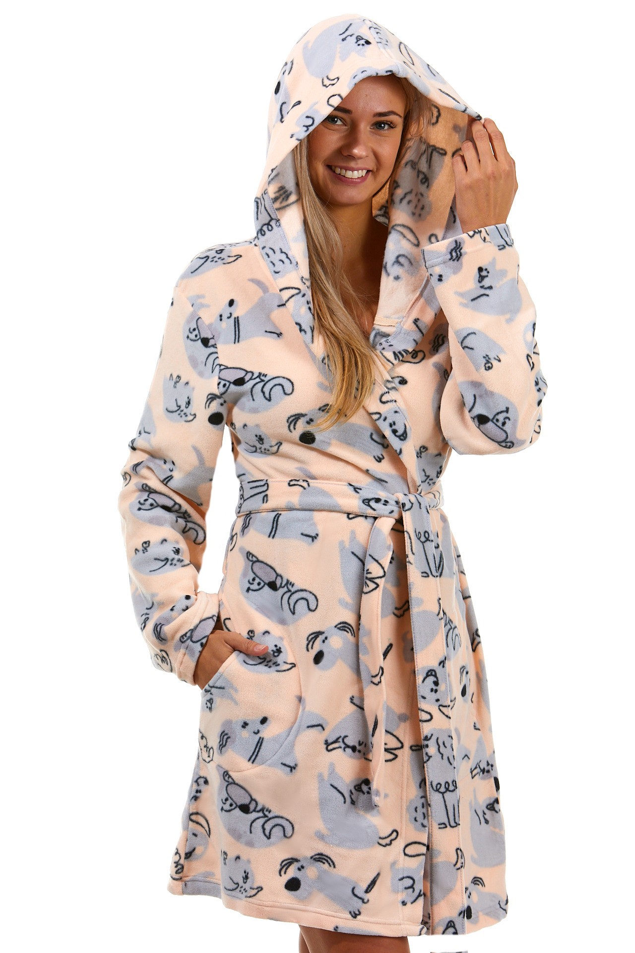 Růžový i šedý dámský teploučký župan grafity se psi a štěňaty