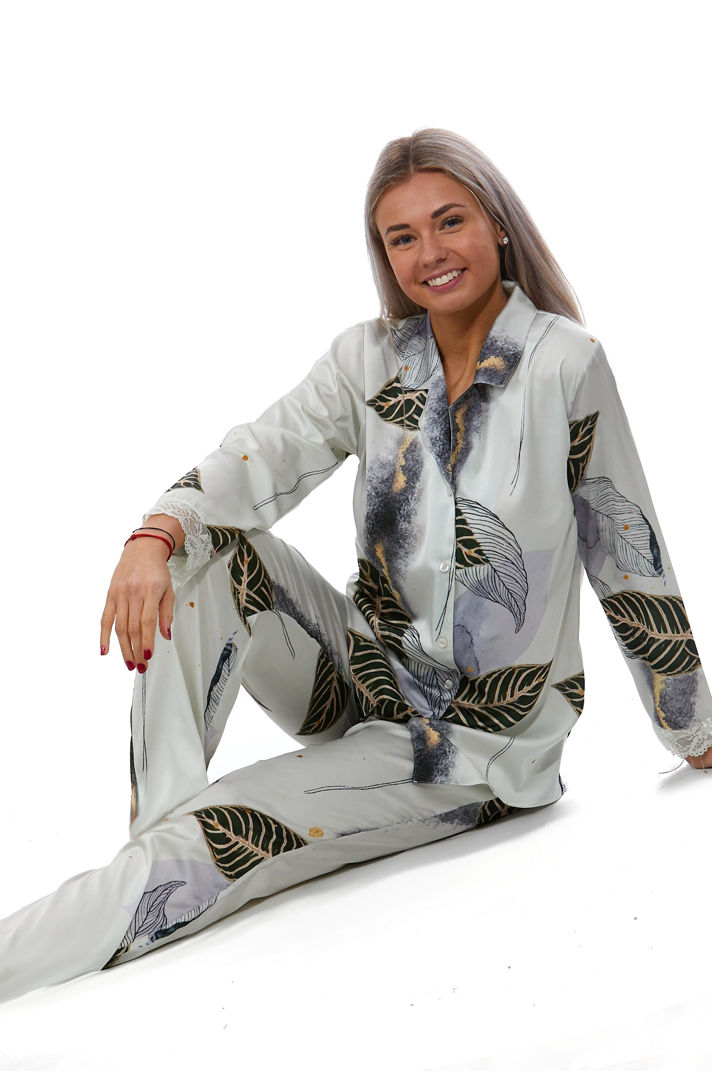 Šedé béžové i zlaté luxusní pyžamo ze saténu na kojení Líbezné listí