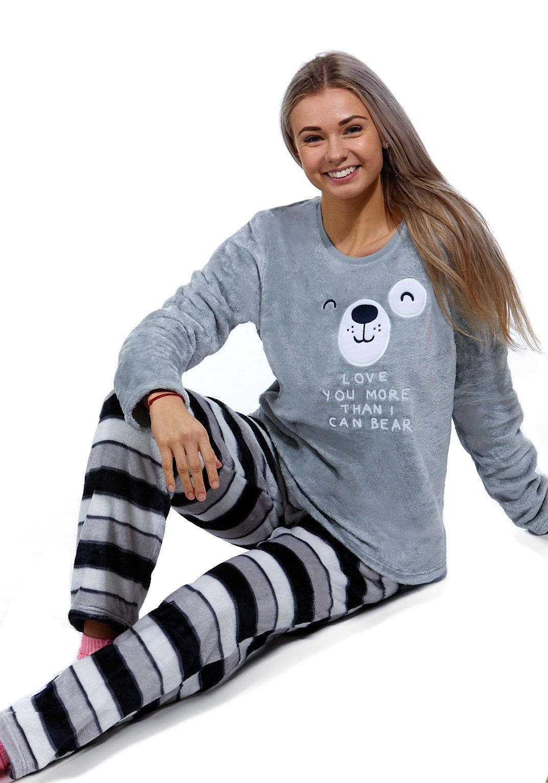 Šedé i černě pruhované extra teplé huňaté pyžamo na zimu pro ženy SPÍCÍ ČUMÁČEK 1Z1663