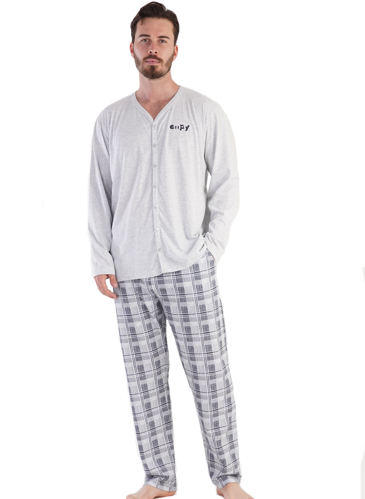 Šedé i modře kárované celopropínací na knoflíky pyžamo pro muže epyc