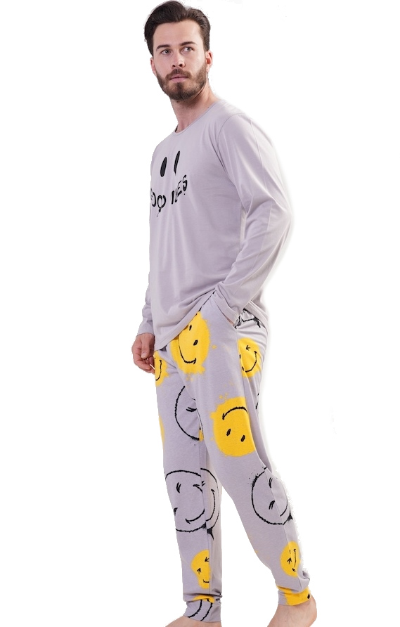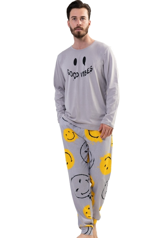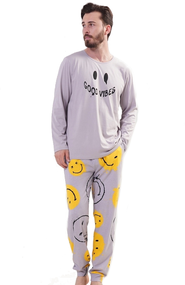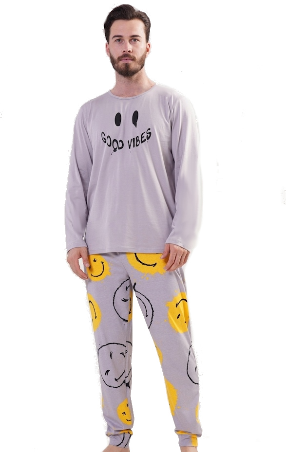 Šedé i žluté pyžamo pro muže se smajlíky, GOOD VIBES