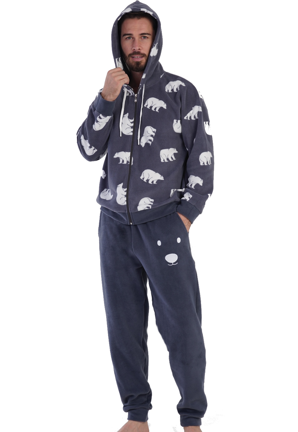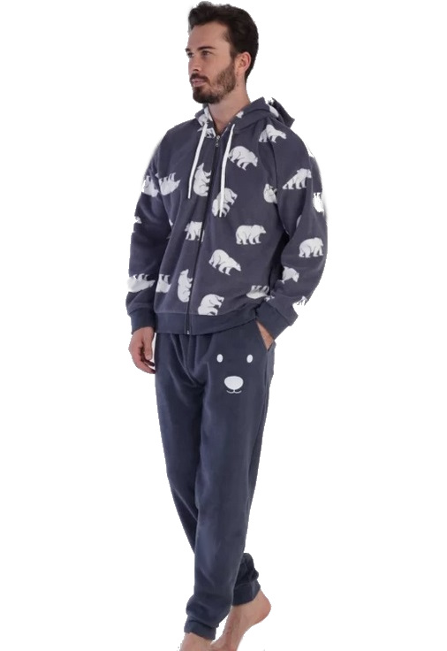Holubí modř a bílé hřejivé pánské pyžamo s kapucí na zip lední medvědi