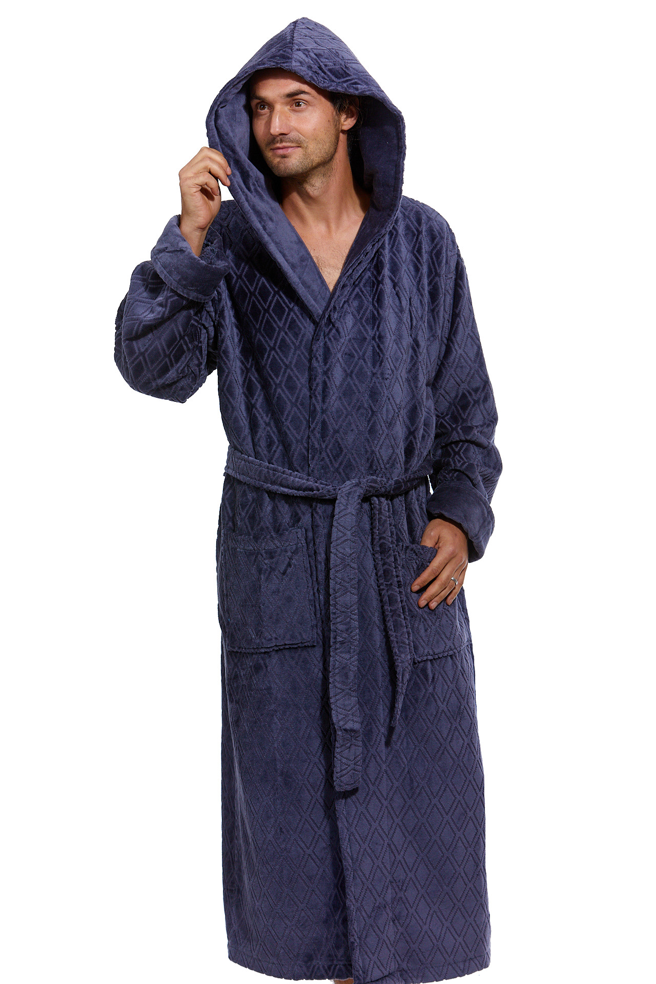 Šedomodrý luxusní župan pro muže s kapucí - Extra froté kárový vzor