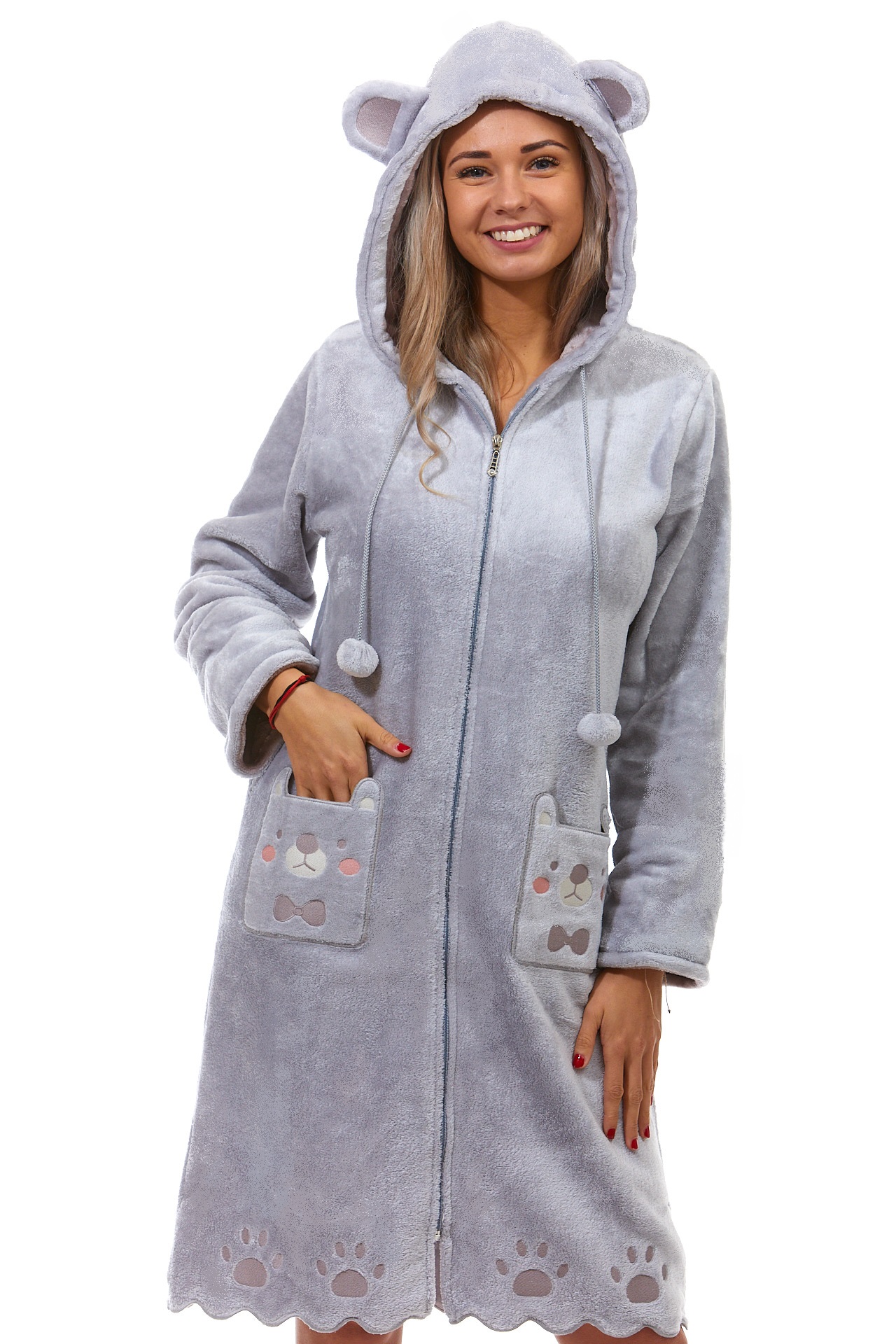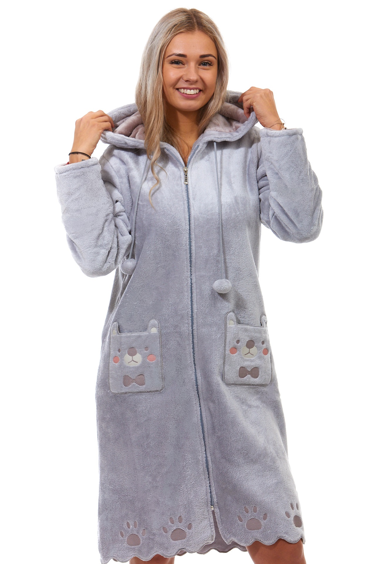 Šedý huňatý župan dámský na zip z bambusu ušatý s tlapky PES