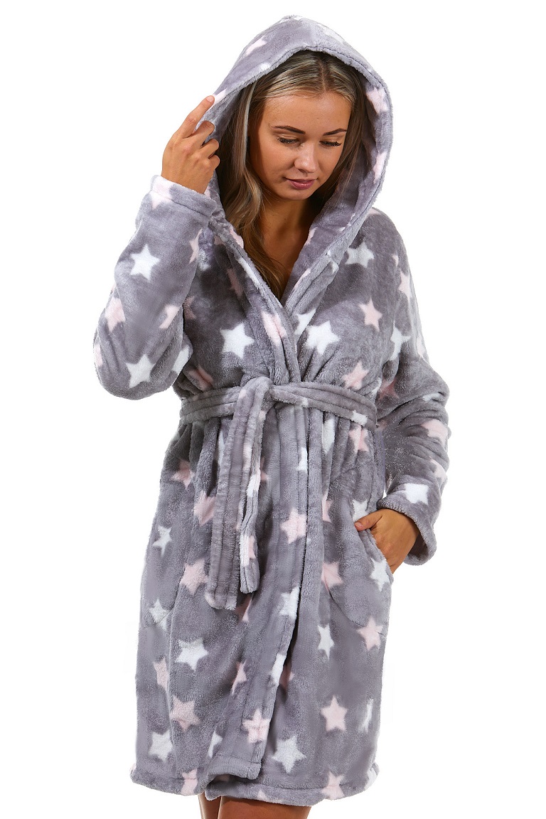 Šedý i růžově hvězdičkový dámský huňatý župan s kapucí