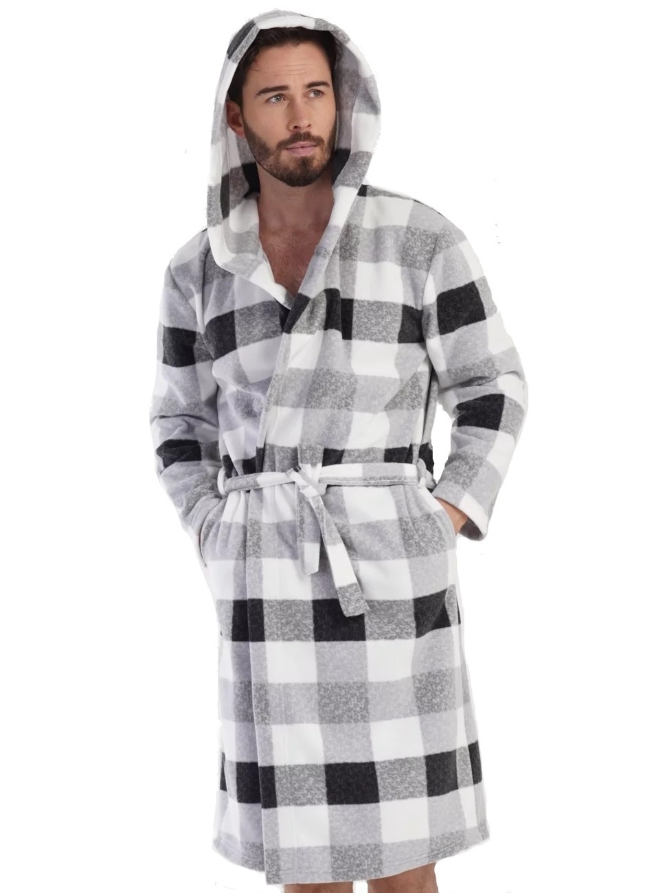 Šedý kostkovaný hřejivý pánský župan teplý fleece s kapucí