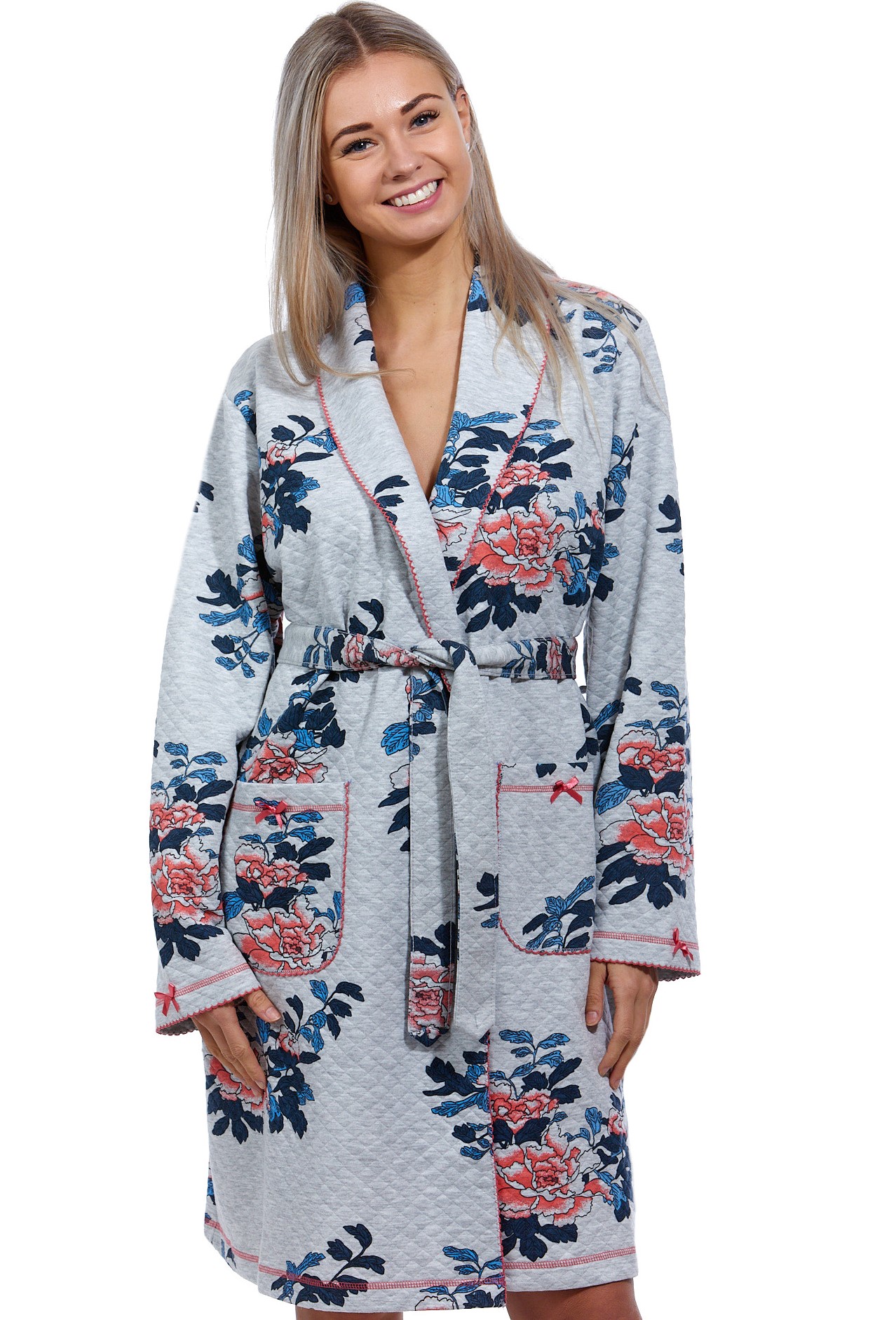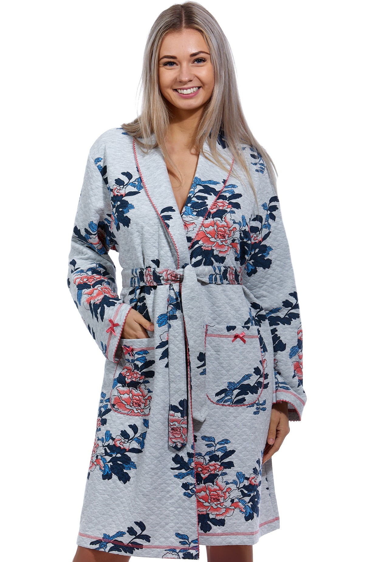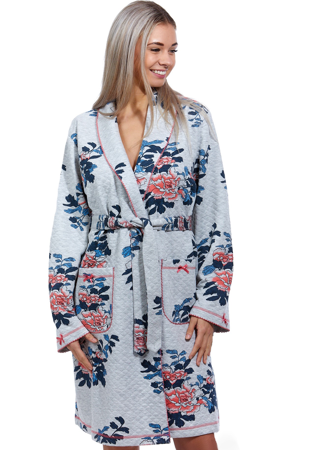 Šedý, meruňový i modrý romantický luxusní květovaný župan pro plnoštíhlé ženy PEONIES 1G0526