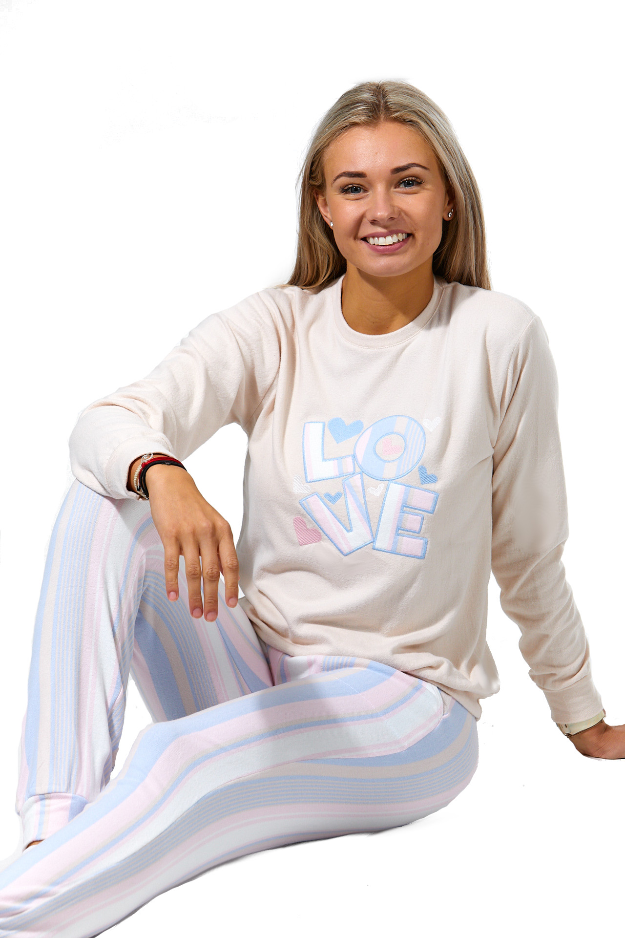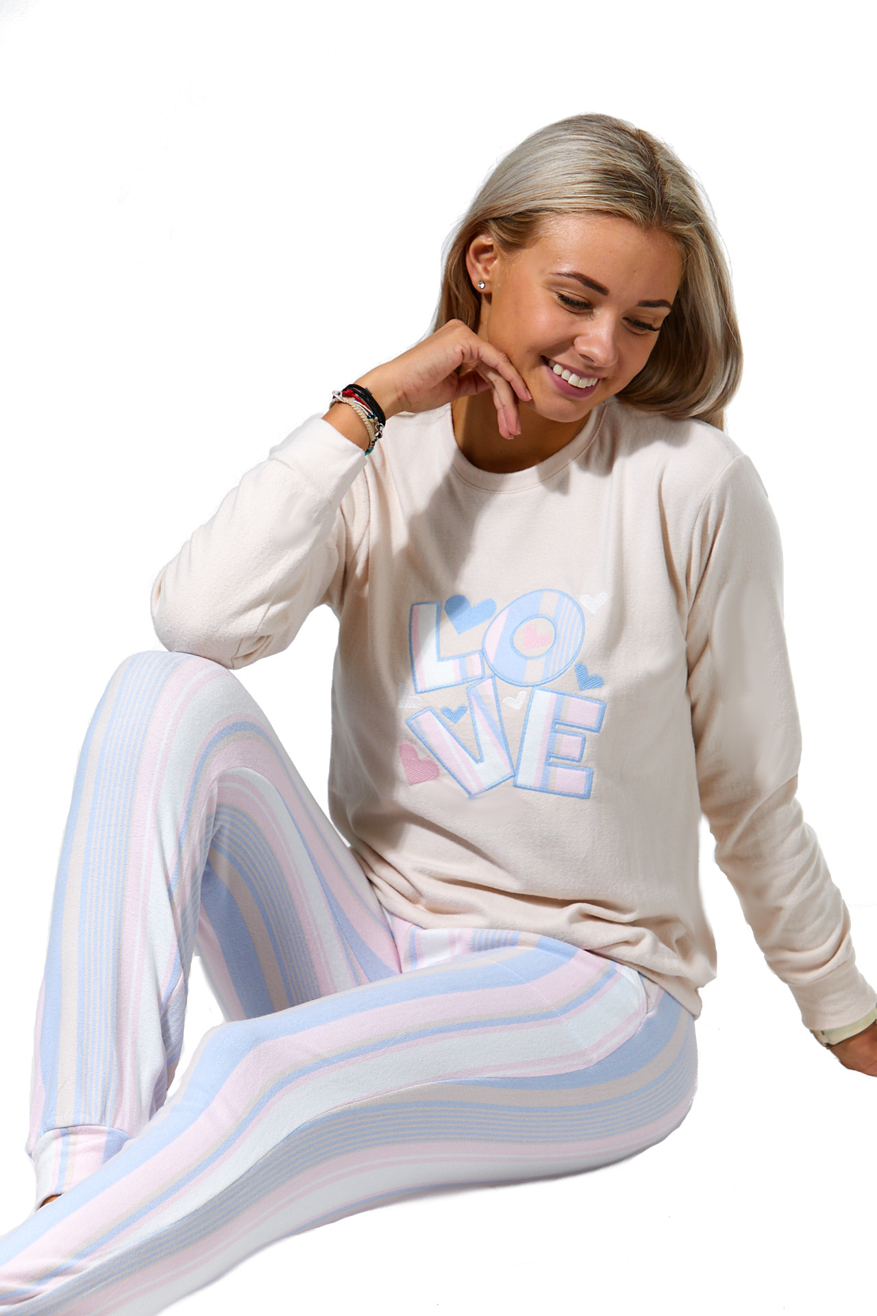Smetanové růžové i modré pruhované luxusní hřejivé dámské pyžamo LOVE