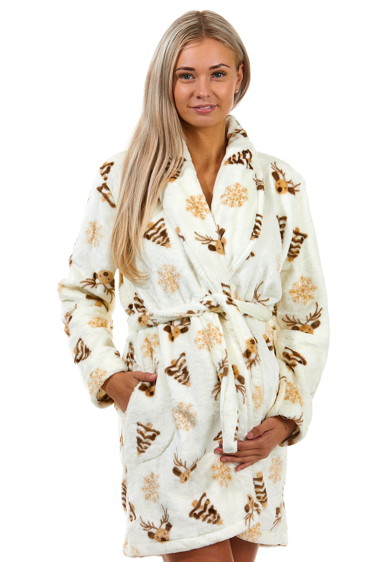 Smetanový, béžový i hnědý huňatý župan s límcem pro ženy na kojení s jeleny, sněhové vločky a Vánoce