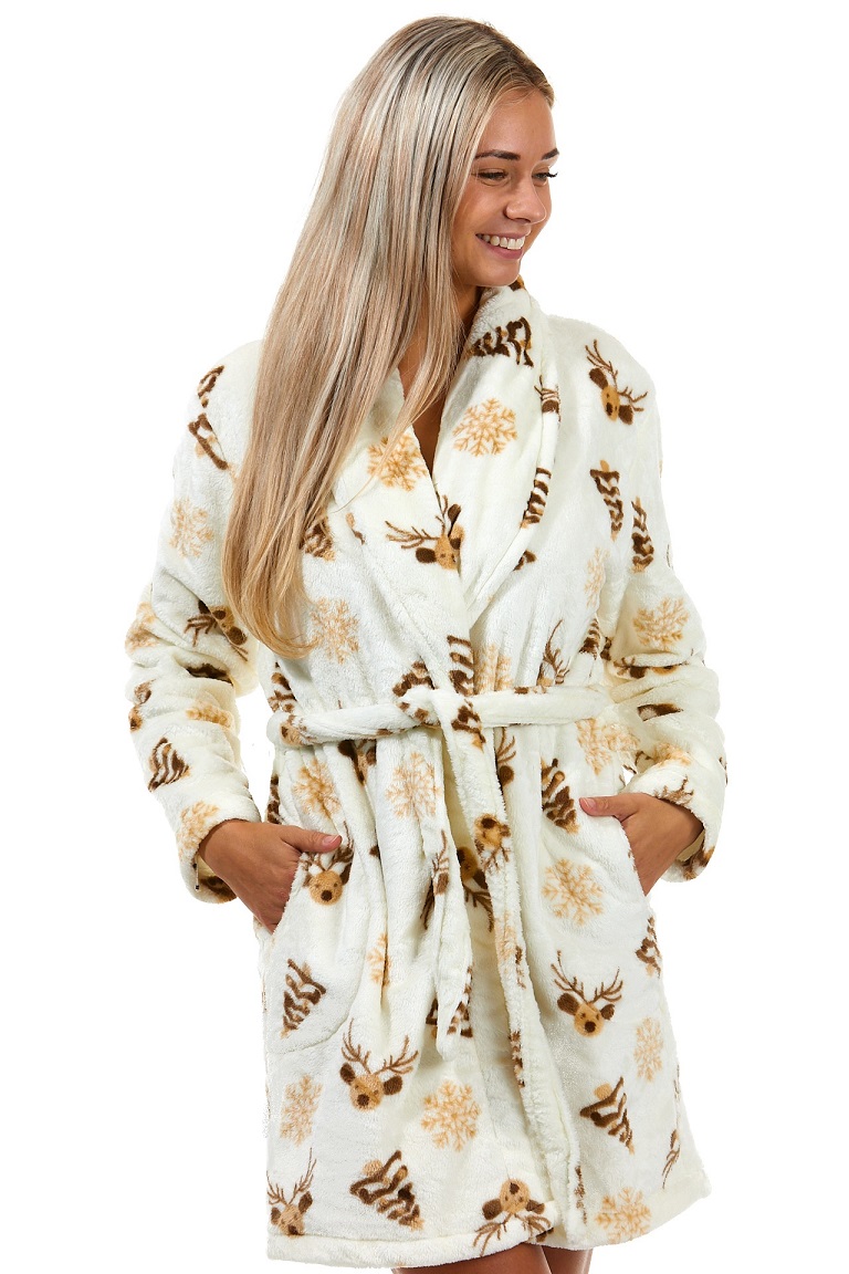 Smetanový, béžový i hnědý huňatý župan s límcem pro ženy s jeleny, sněhové vločky a Vánoce
