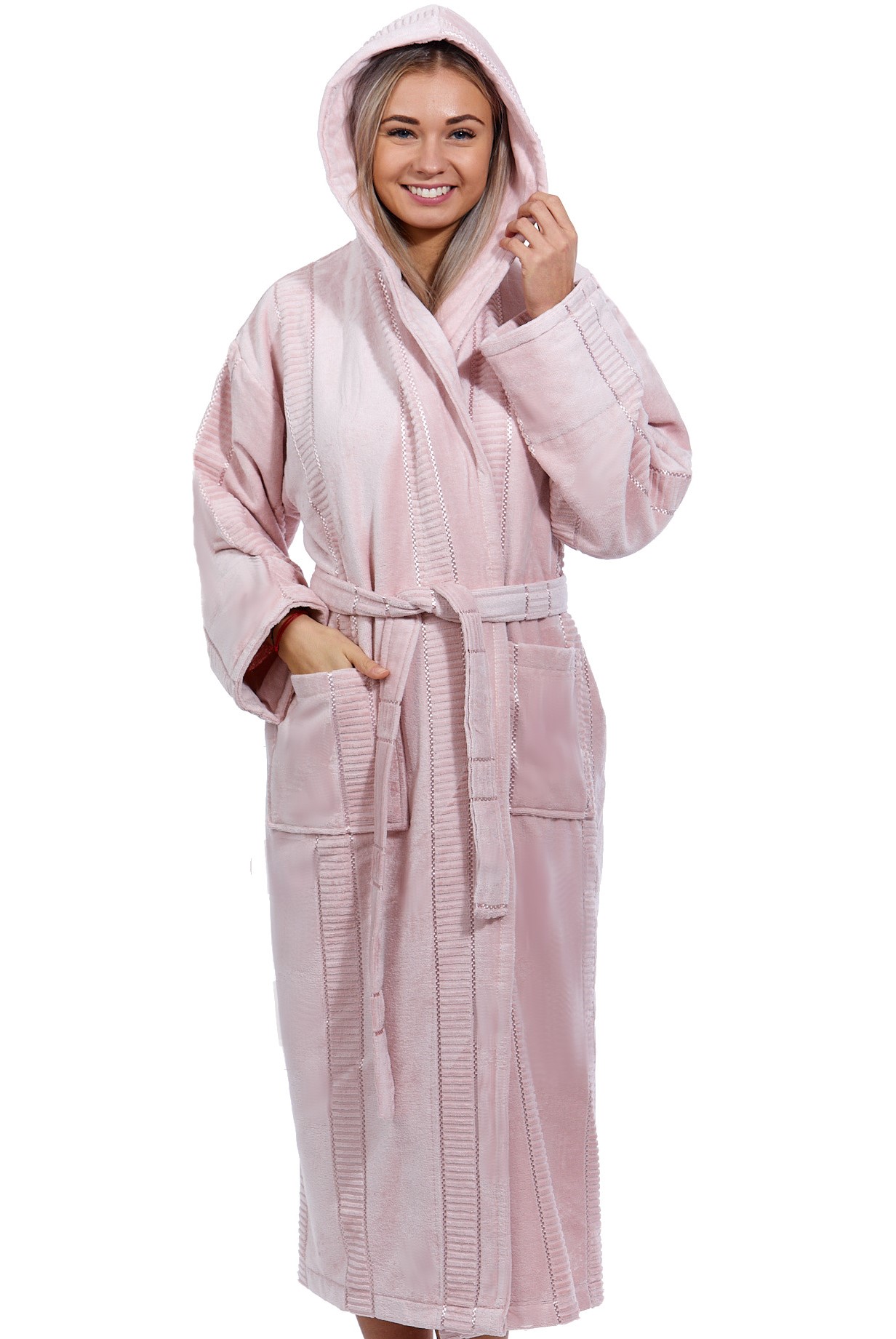 Světle růžový luxusní dlouhý župan na kojení z extra froté NORSKÉ PRUHY