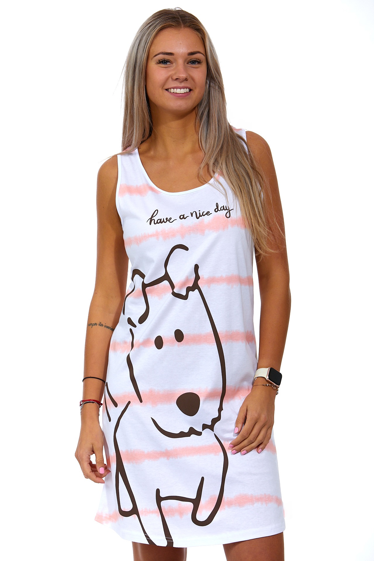 Bílo růžová pruhovaná dámská noční košilka bez rukávů Pes Teriér