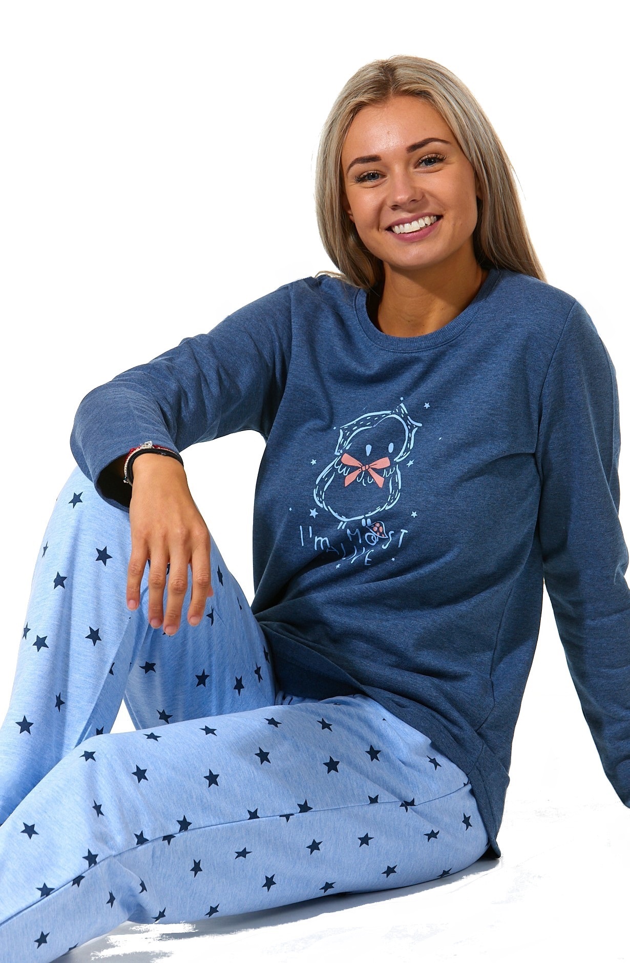 Tmavě modré hvězdičkové super teplé pyžamo z bavlny na zimu pro ženy se Sovičkou