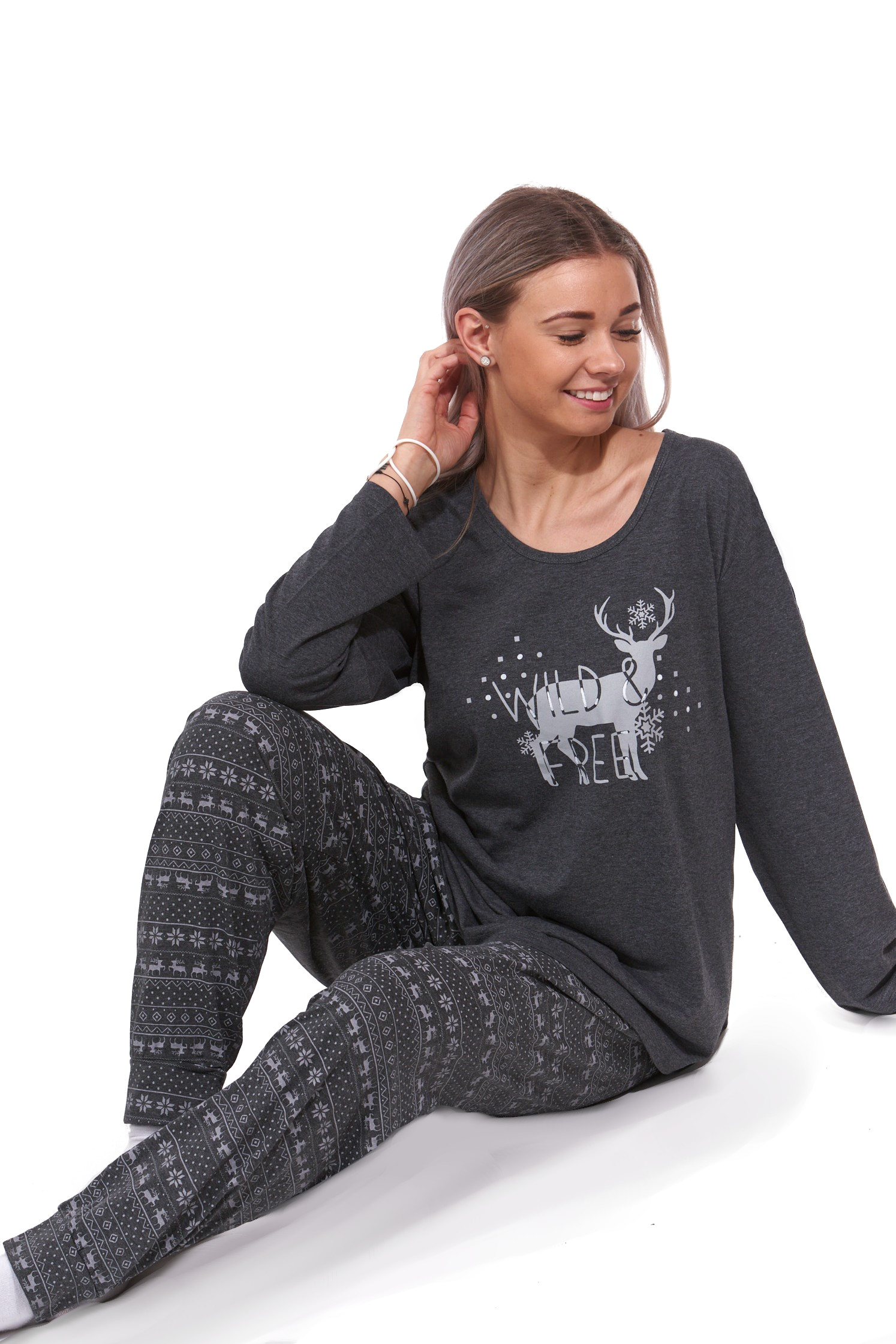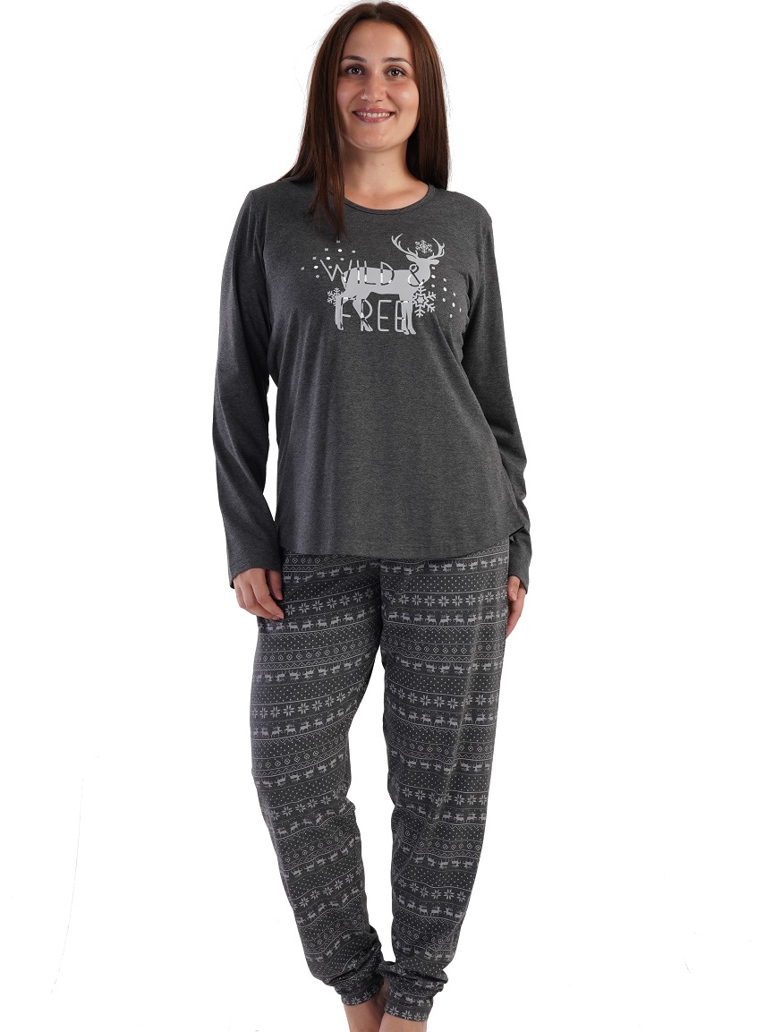 Tmavě šedé pyžamo s norským vzorem pro plnoštíhlé ženy - Jelen v zimně a sněhové vločky