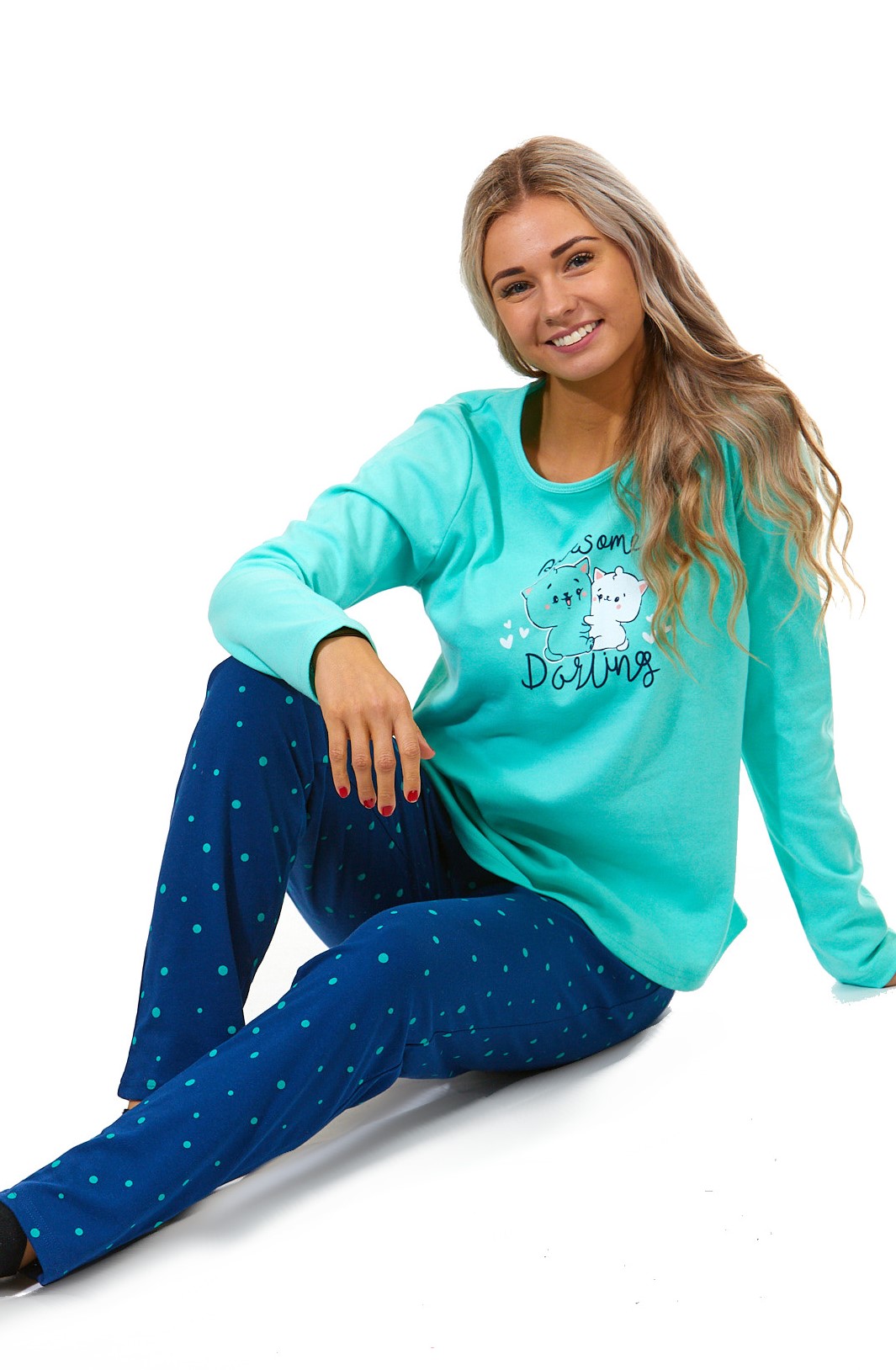 Zelená i modré luxusní hřejivé dámské pyžamo Zamilované kočičky.