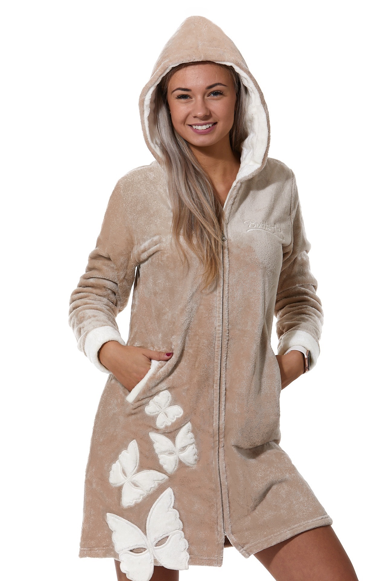 Béžový župan dámský huňatý na zip s motýlky